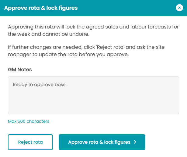 Add any Notes and press 'approve rota & lock figures' or to reject press 'Reject Rota'